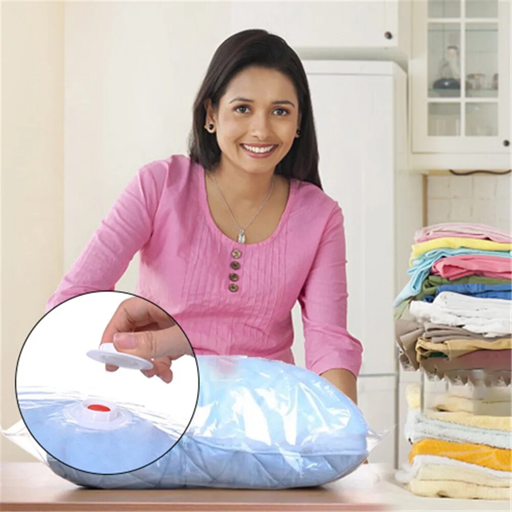 لا تقتصر فائدة أكياس الضغط على تخزين الملابس فقط، بل يمكن استخدامها أيضًا لتخزين المفارش والبطانيات، سواء في خزانة الملابس أو في شنطة السفر أو حتى في أماكن التخزين المختلفة