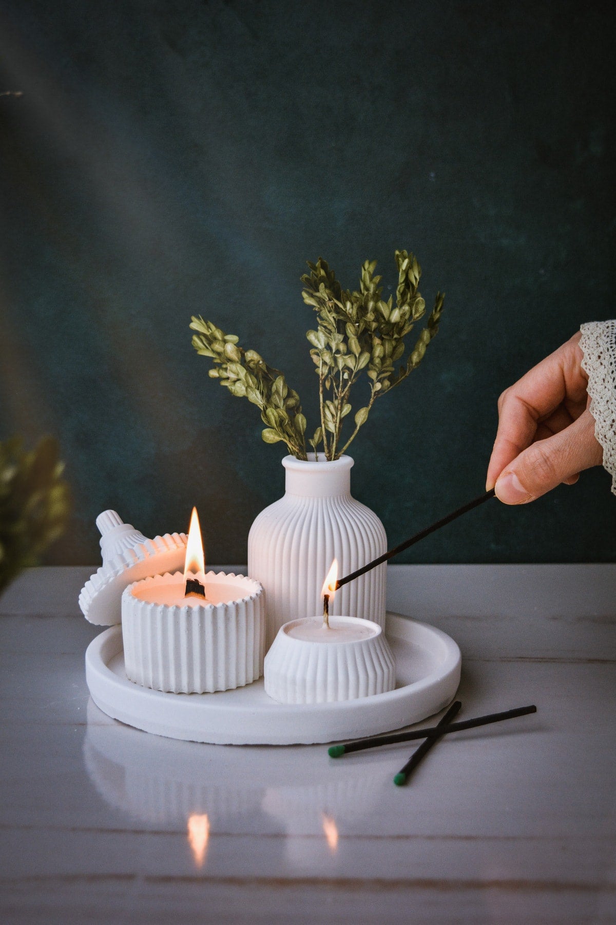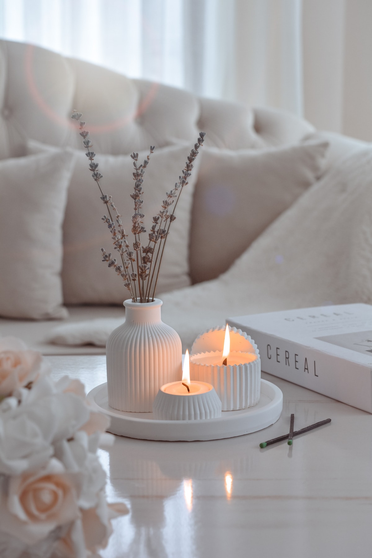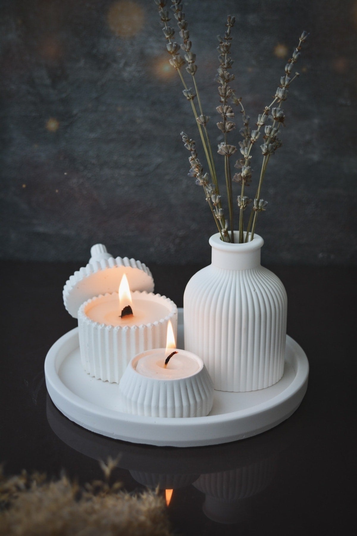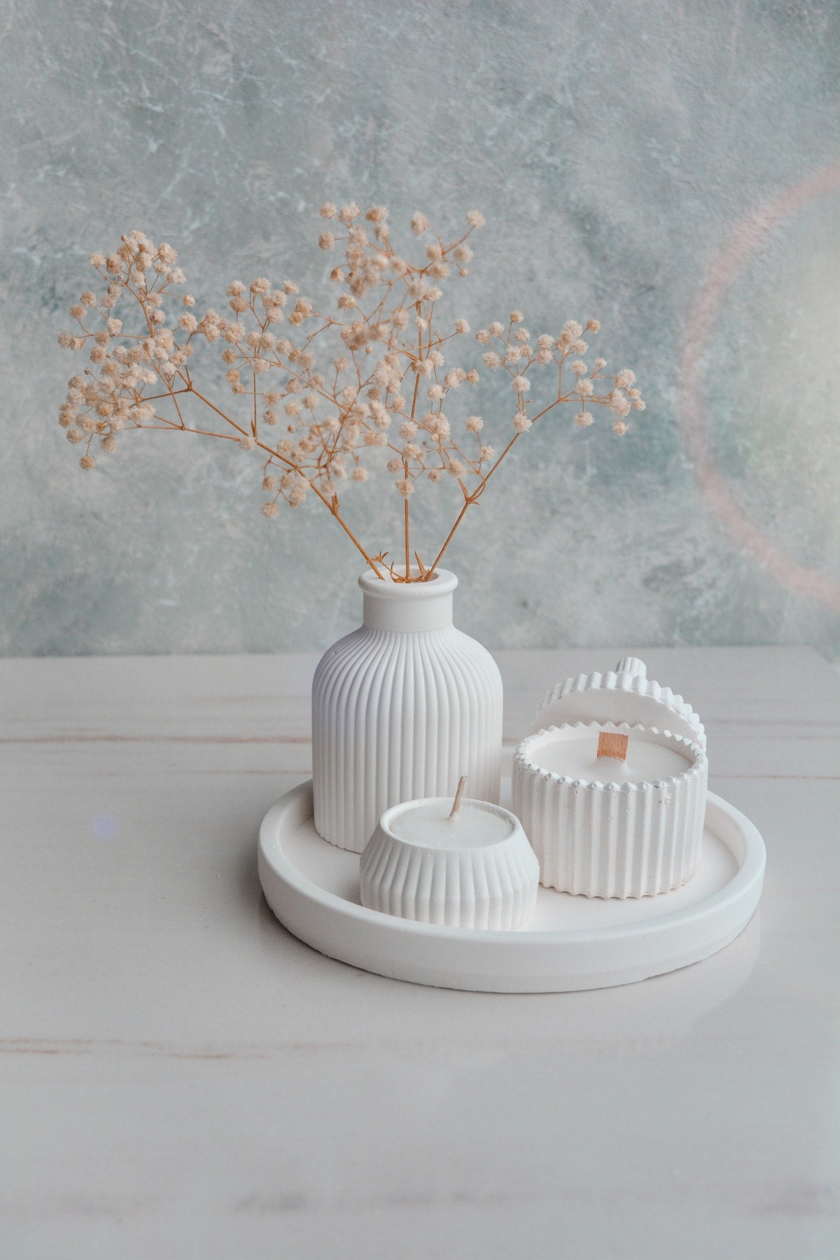مع مجموعتنا الجديدة المكونة من طقم إكسسوارات ب 5 قطع : شمعة الصويا المعطرة بتصميم خاص باللون الأبيض ومزهرية وشمعة صغيرة وصينية اكسسوارات